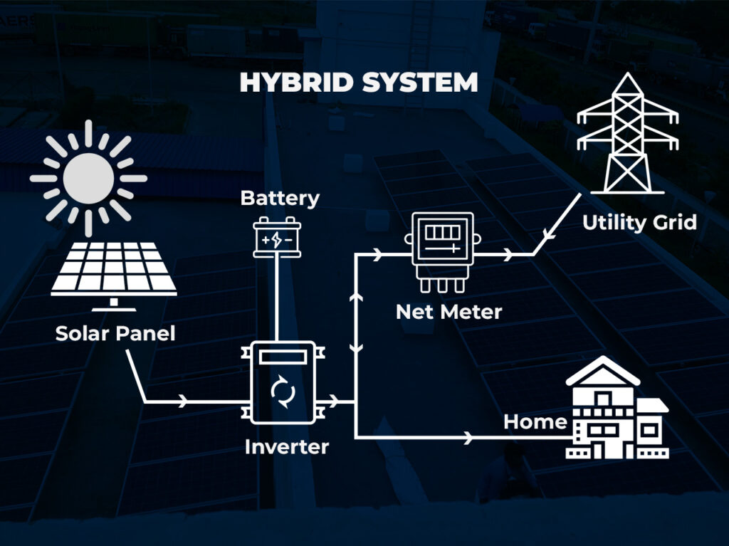 In the context of solar energy, hybrid systems often involve the integration of solar panels with other energy sources like wind turbines, batteries, diesel generators, or grid connections. The goal is to optimize energy production, storage, and utilization by leveraging multiple sources based on the availability and demand.